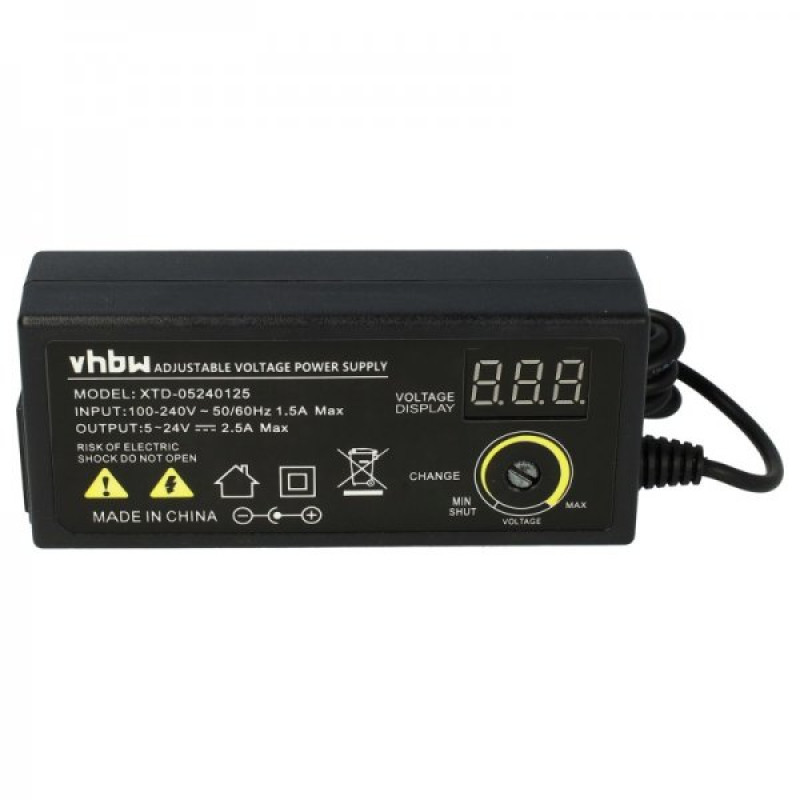 Alimentatore universale con attacchi per tutti i tipi di laptop con protezione da sovraccarico, protezione da sovracorrente e protezione dalla temperatura, certificato RoHS e 10 allegati allegati. Impostazione della tensione di uscita tra 5 V e 24 V con indicazione LED della tensione attuale.