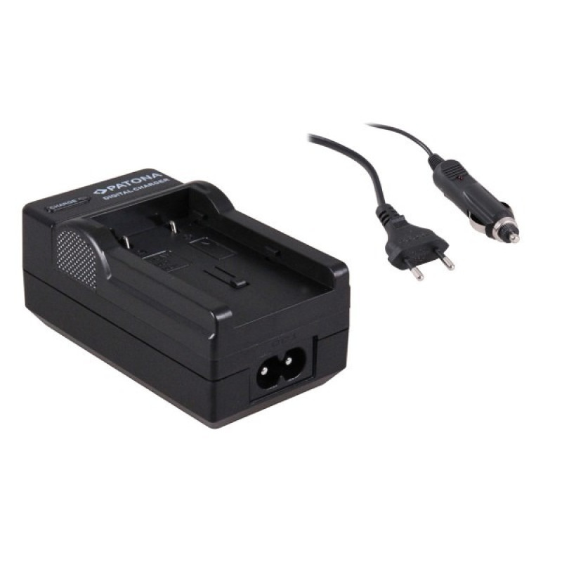 Alimentatore da tavolo compatto per caricare batterie per fotocamere / videocamere. Il caricatore posso essere inserito e una presa elettrica o e una presa per auto. Il LED di stato indica lo stato della carica della batteria. Il alimentatore si spegne automaticamente quando la batteria si ricarica.
